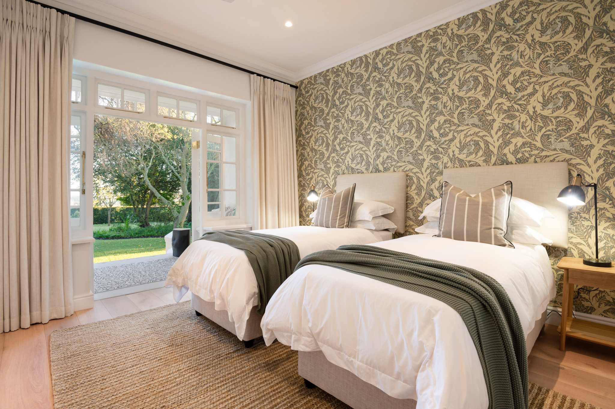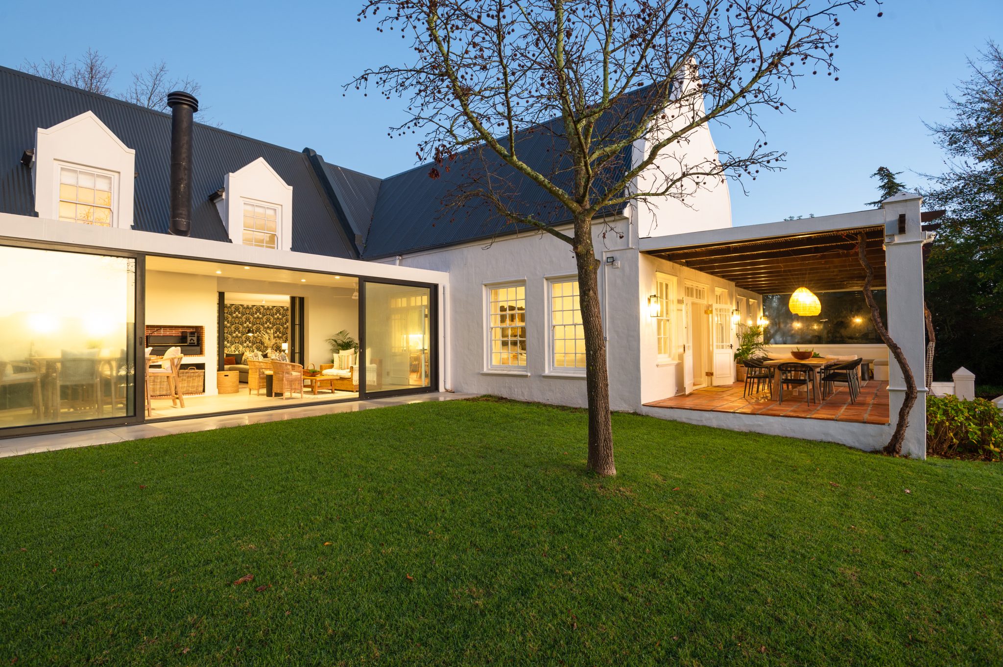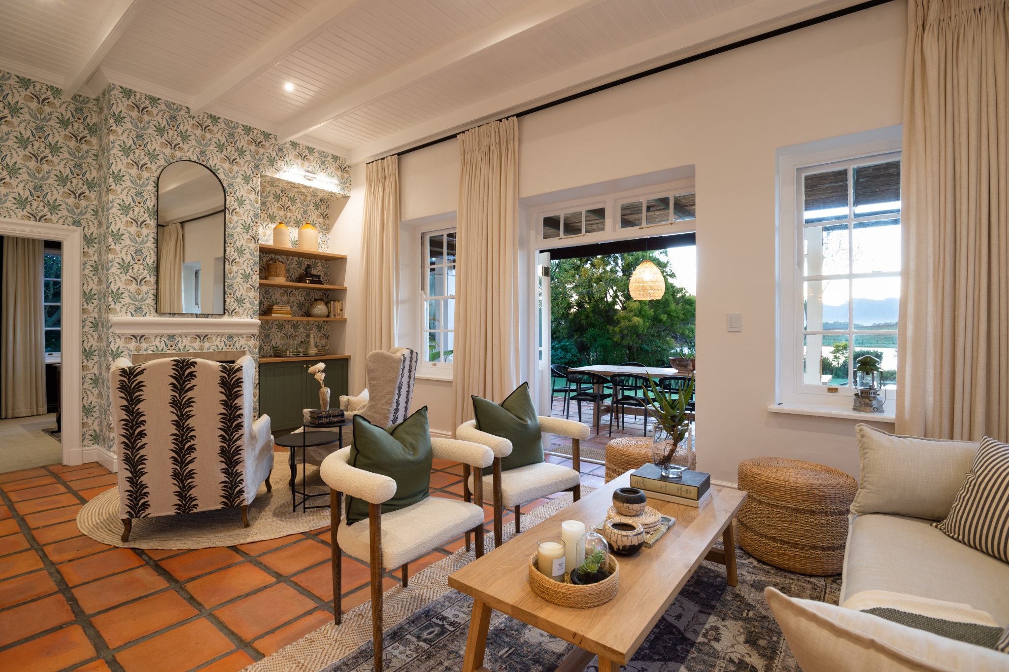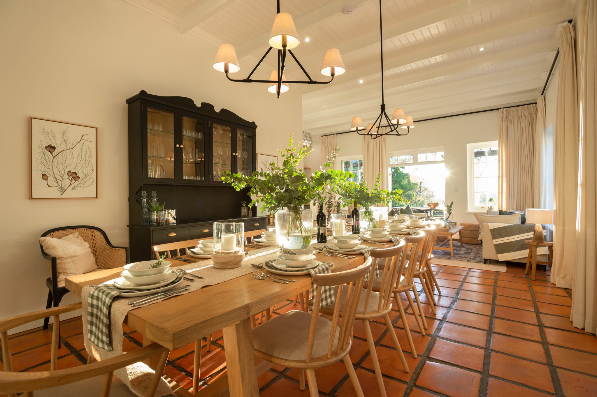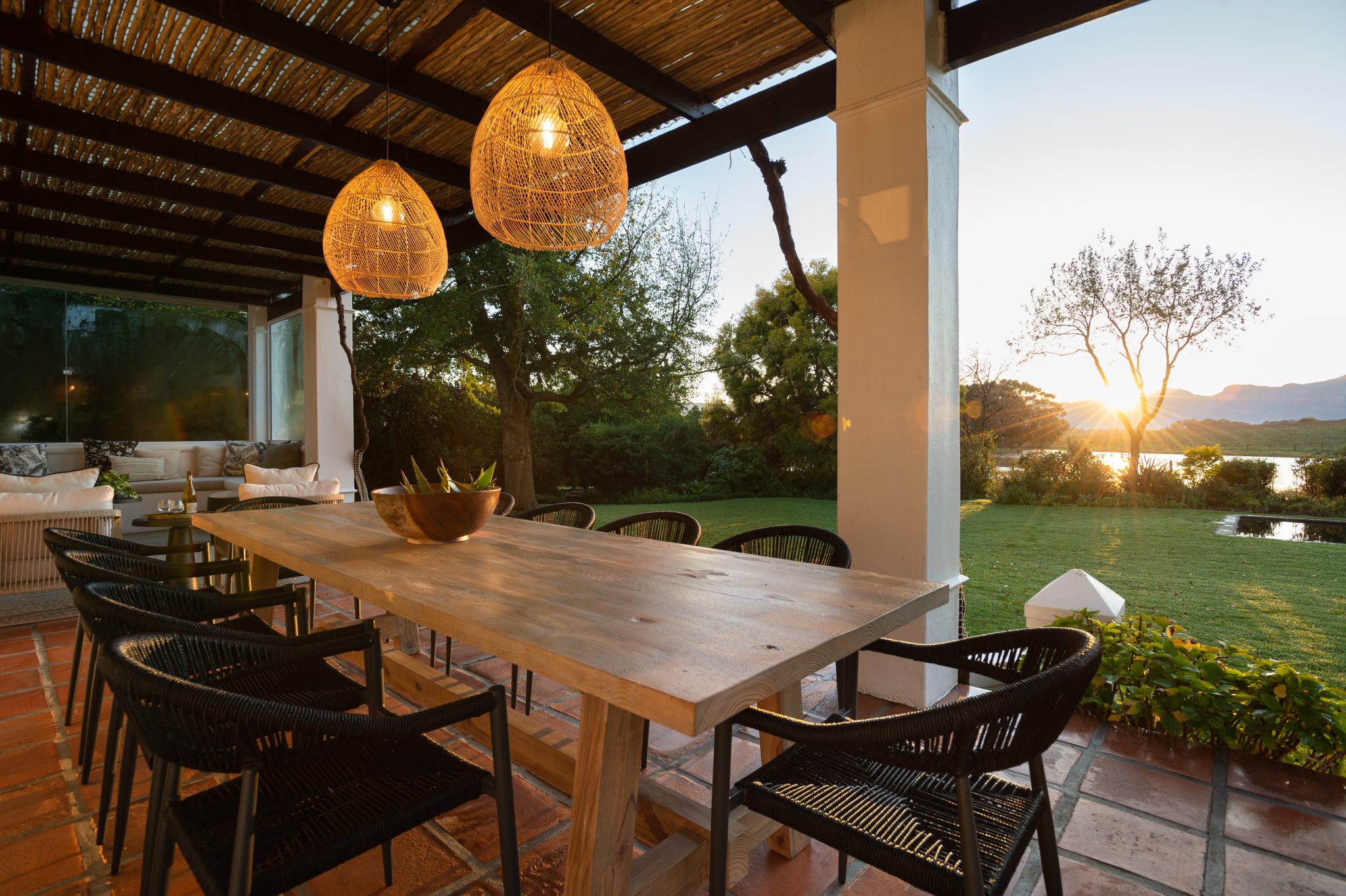 The Manor has a fully equipped chef’s kitchen, numerous lounge areas for relaxing indoor and covered outdoors with an additional covered braai room, two fireplaces, large inviting saltwater swimming pool and luscious herb and vegetable garden for guests to forage. Fitted with only the best, the interior is luxurious yet unpretentious and invites guests to enjoy it as a home away from home. Long dining tables inside and outside on the covered veranda with breathtaking views, allow for long leisurely lunches or dinners.