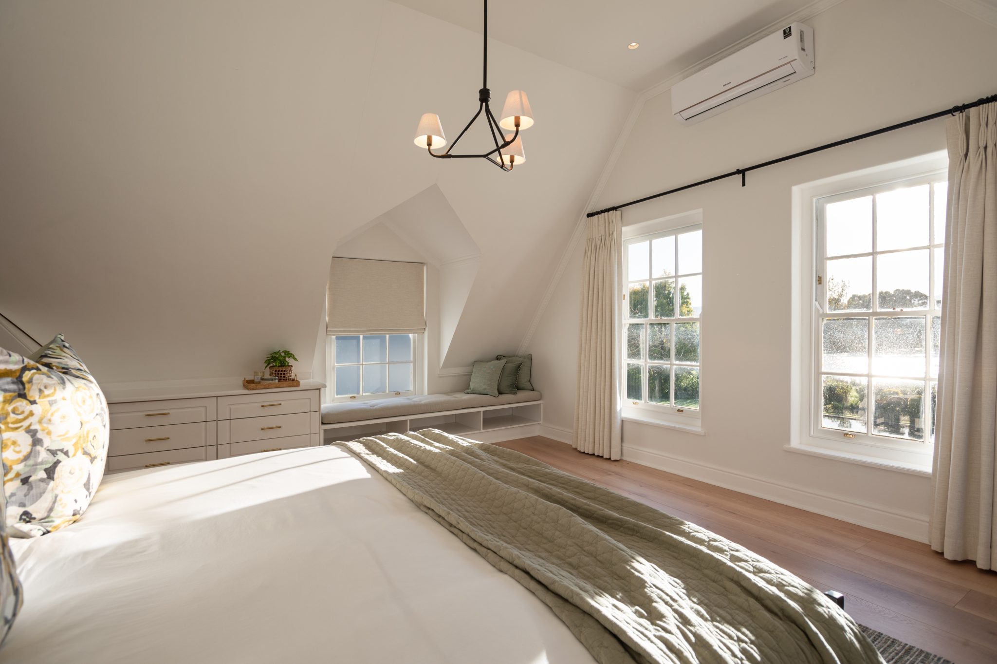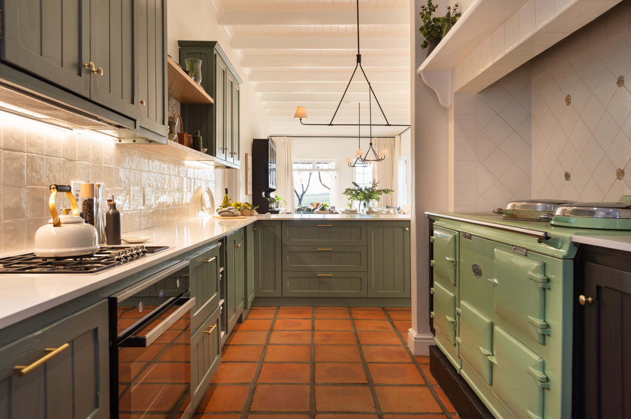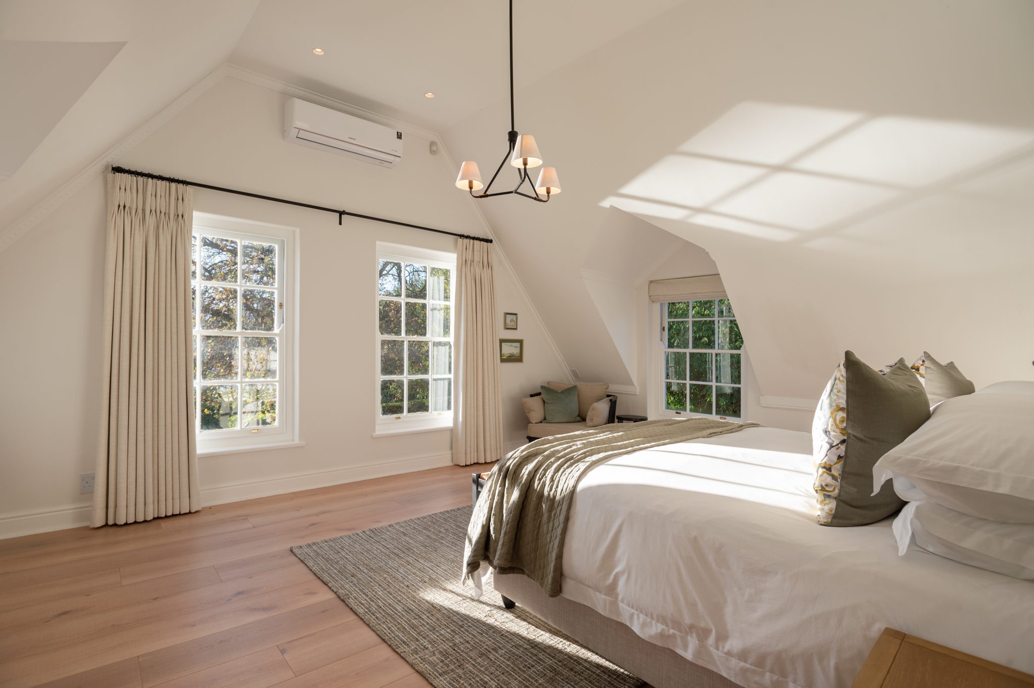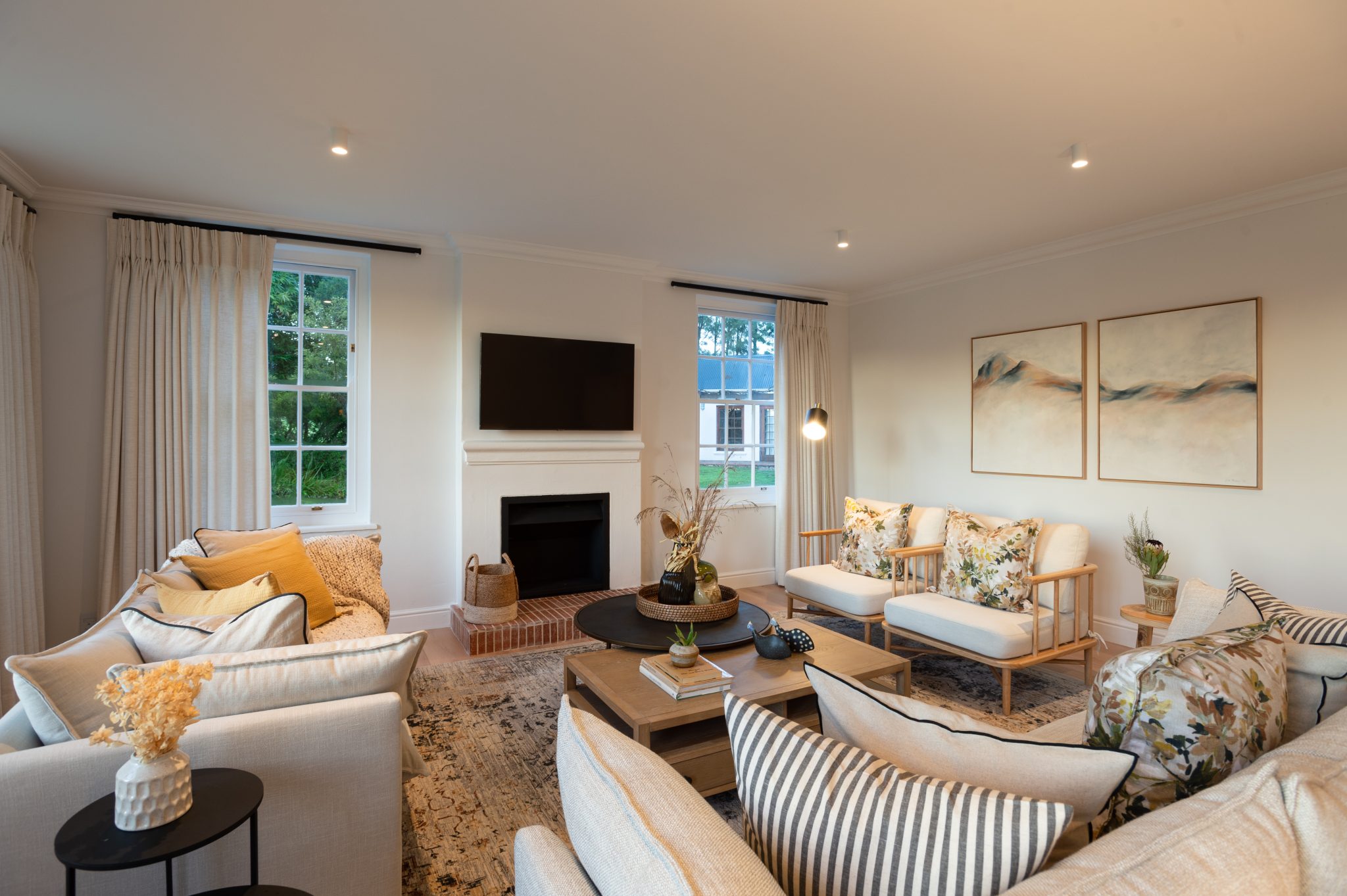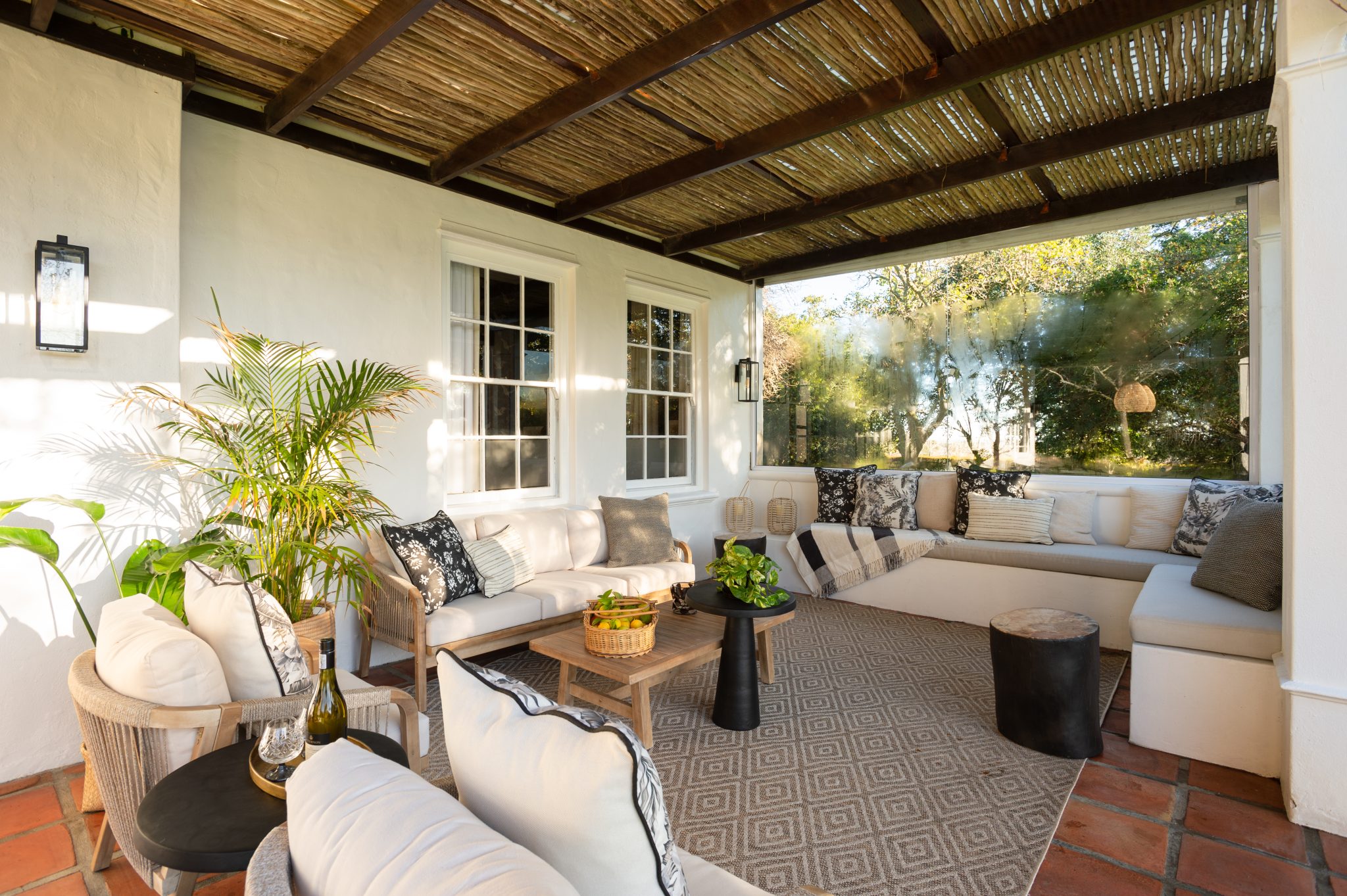 The Manor has a fully equipped chef’s kitchen, numerous lounge areas for relaxing indoor and covered outdoors with an additional covered braai room, two fireplaces, large inviting saltwater swimming pool and luscious herb and vegetable garden for guests to forage. Fitted with only the best, the interior is luxurious yet unpretentious and invites guests to enjoy it as a home away from home. Long dining tables inside and outside on the covered veranda with breathtaking views, allow for long leisurely lunches or dinners.
