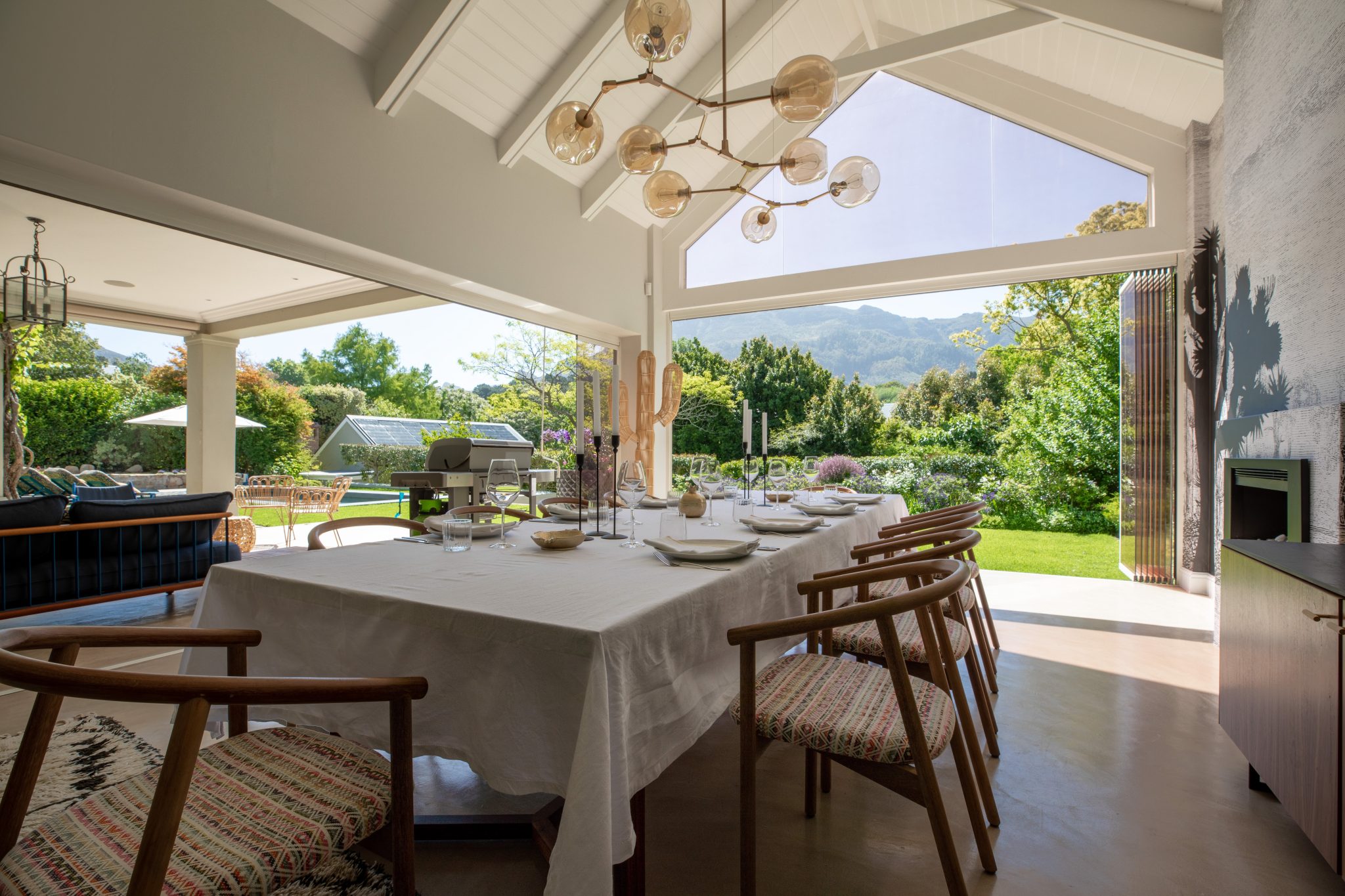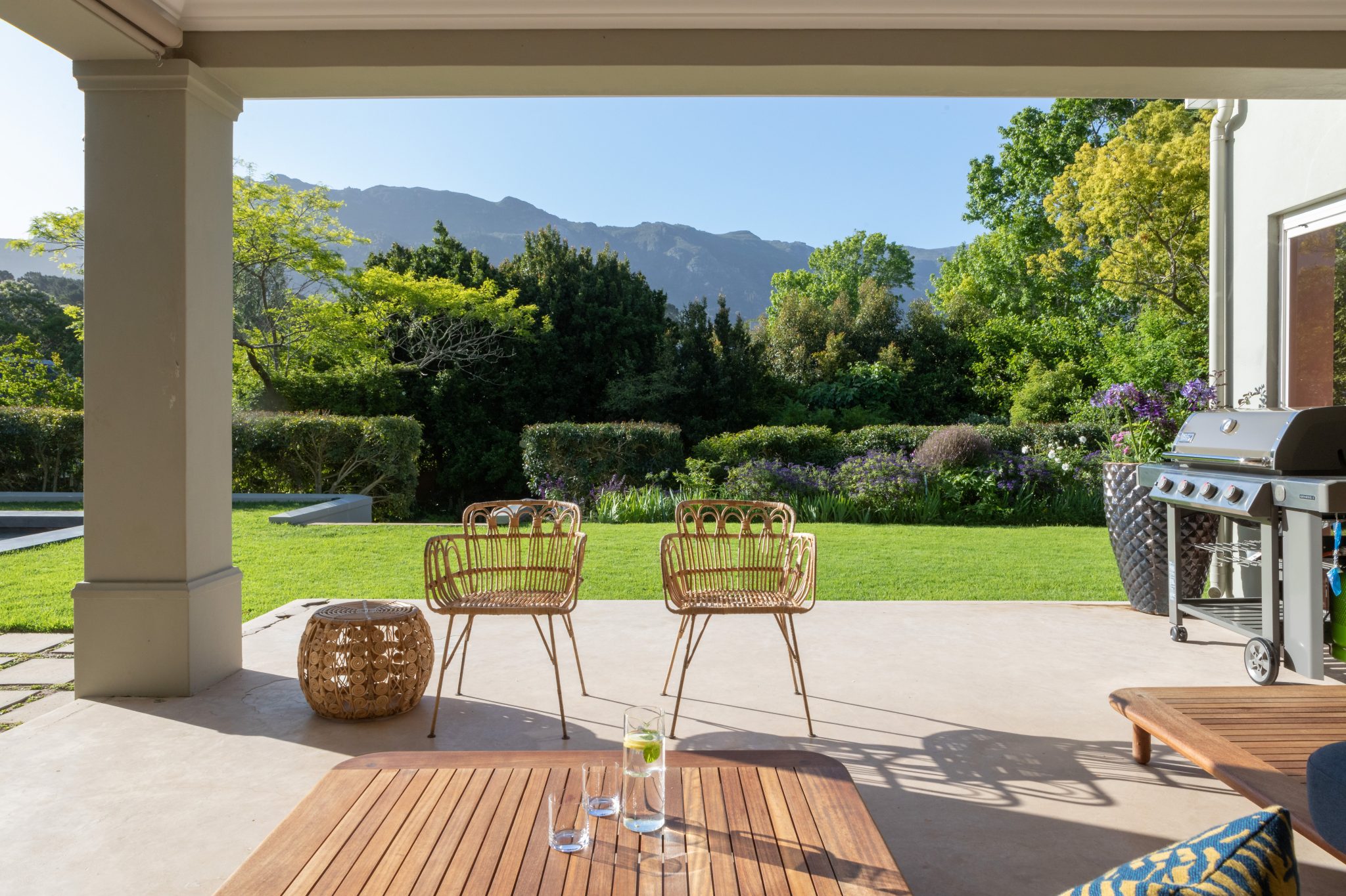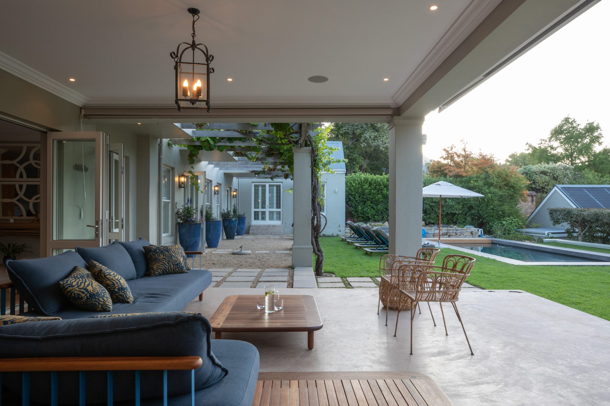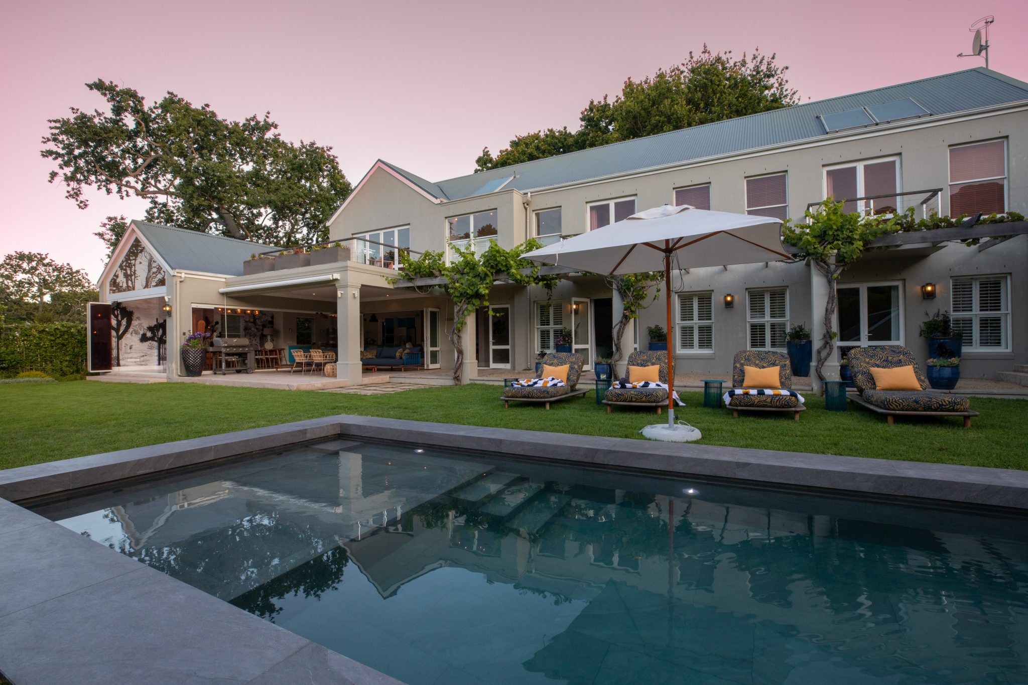 Stylish contemporary interiors and beautiful indoor/outdoor flow creates a seamlessly comfortable and easy space. A covered verandah – with lounge and outdoor dining zones (complete with braai and fireplace) – leading onto a lush garden and inviting pool is where you’ll want to set up camp all day.