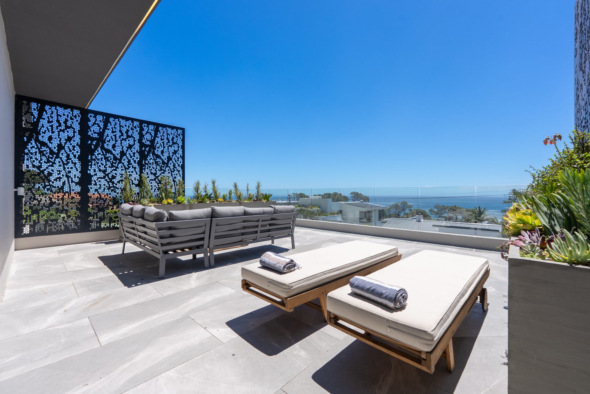 Private balcony with loungers and outdoor seating